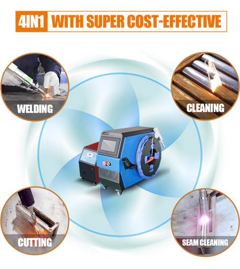 The 4 in 1 laser welding cleaning cutting machine can not only clean the metal surface contaminants,but also weld and cut various metal materials.