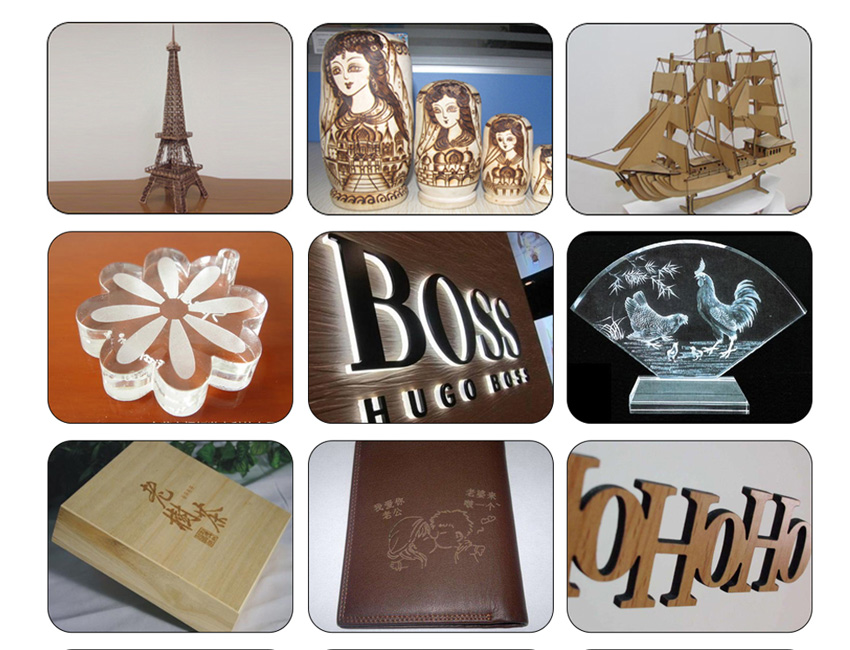 Arts and crafts, advertising, decoration, wood working, leather manufacturing, packaging, printing, mould making, furniture, clothing andbrand making etc. Applicable materials: Acrylic, leather, wood, rubber, double-color board, MDF, plywood, bamboo, paper, cardboard, marble, granite, stone, glass, fabric, textile, coated metal, painted metal, anodised aluminum etc.