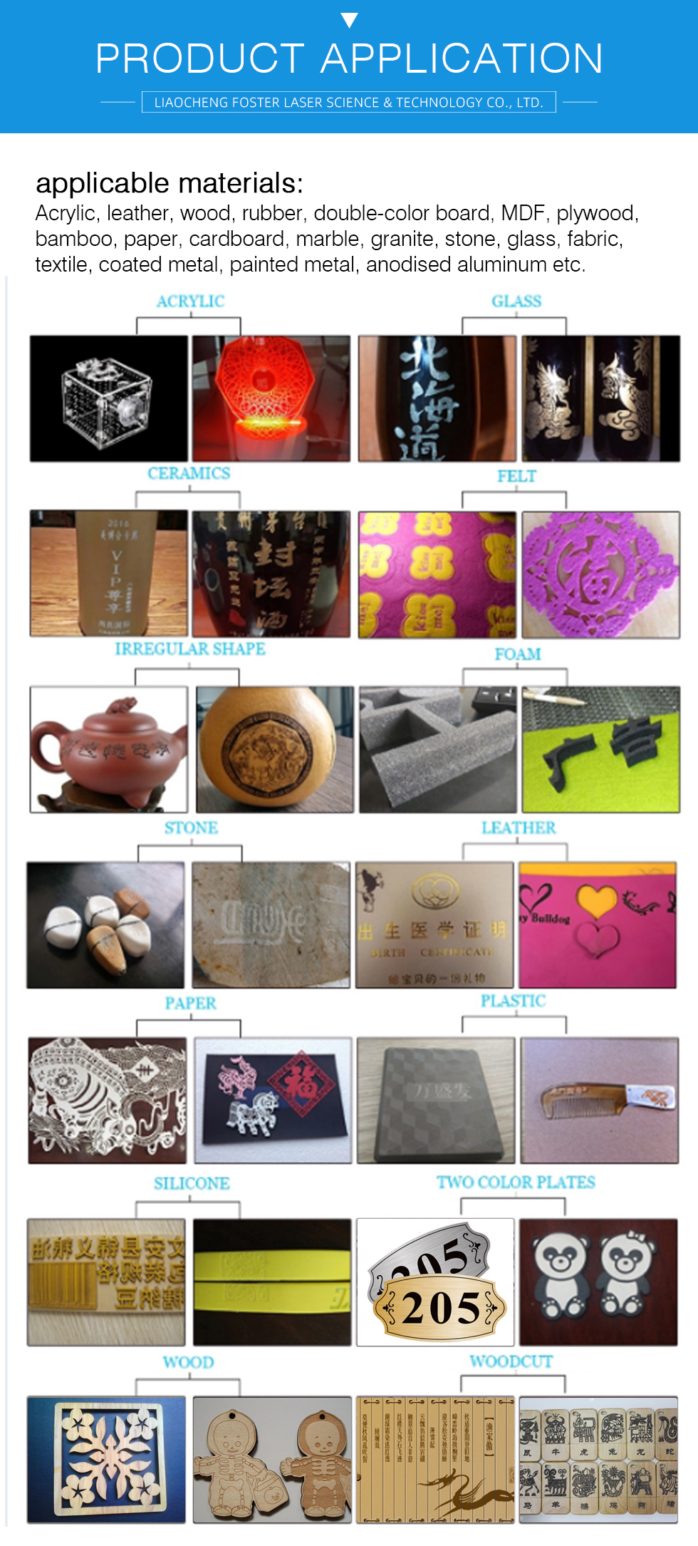 Application materials: can be in bamboo, crystal, ox horn, paper, organic glass, marble, cloth, leather, rubber, plastic, and other nonmetal materials for laser processing. Clothing, embroidery, cloth toys, home decoration cloth art, handbags, gloves, toy industry in leather cutting and surface engraving.Craft, model, advertising, decoration, electrical appliances, plastic industry acrylic board, MDF, and other nonmetal sheet precision cutting.